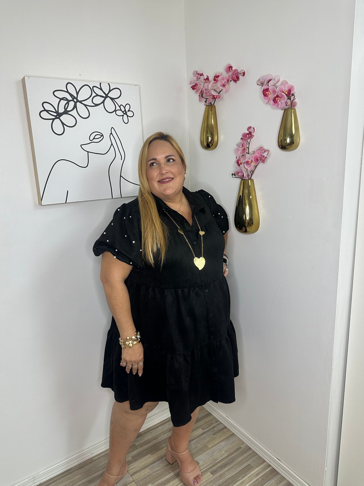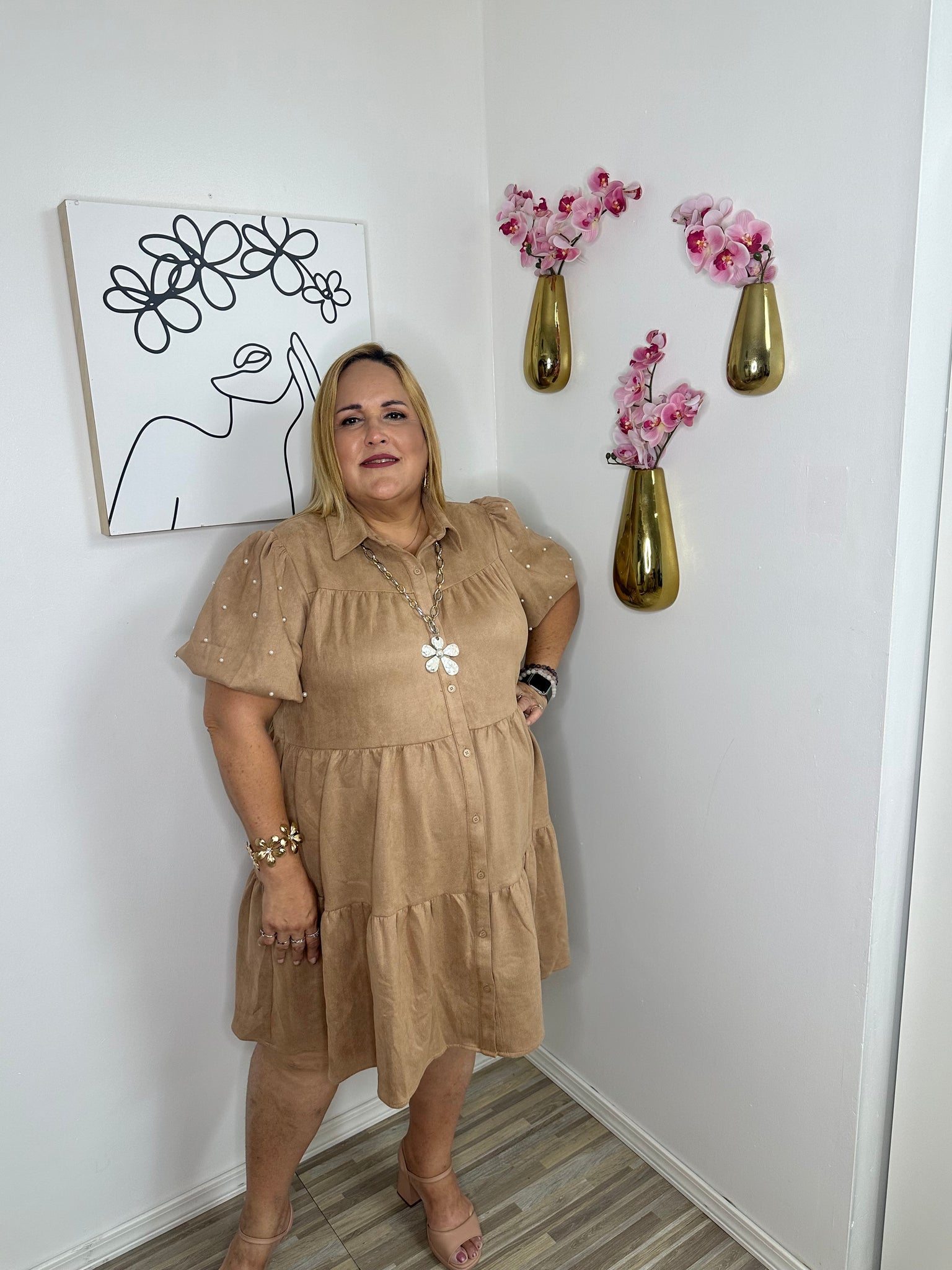 Tiered suede-textured shirt dress with puff sleeves and pearl accents.