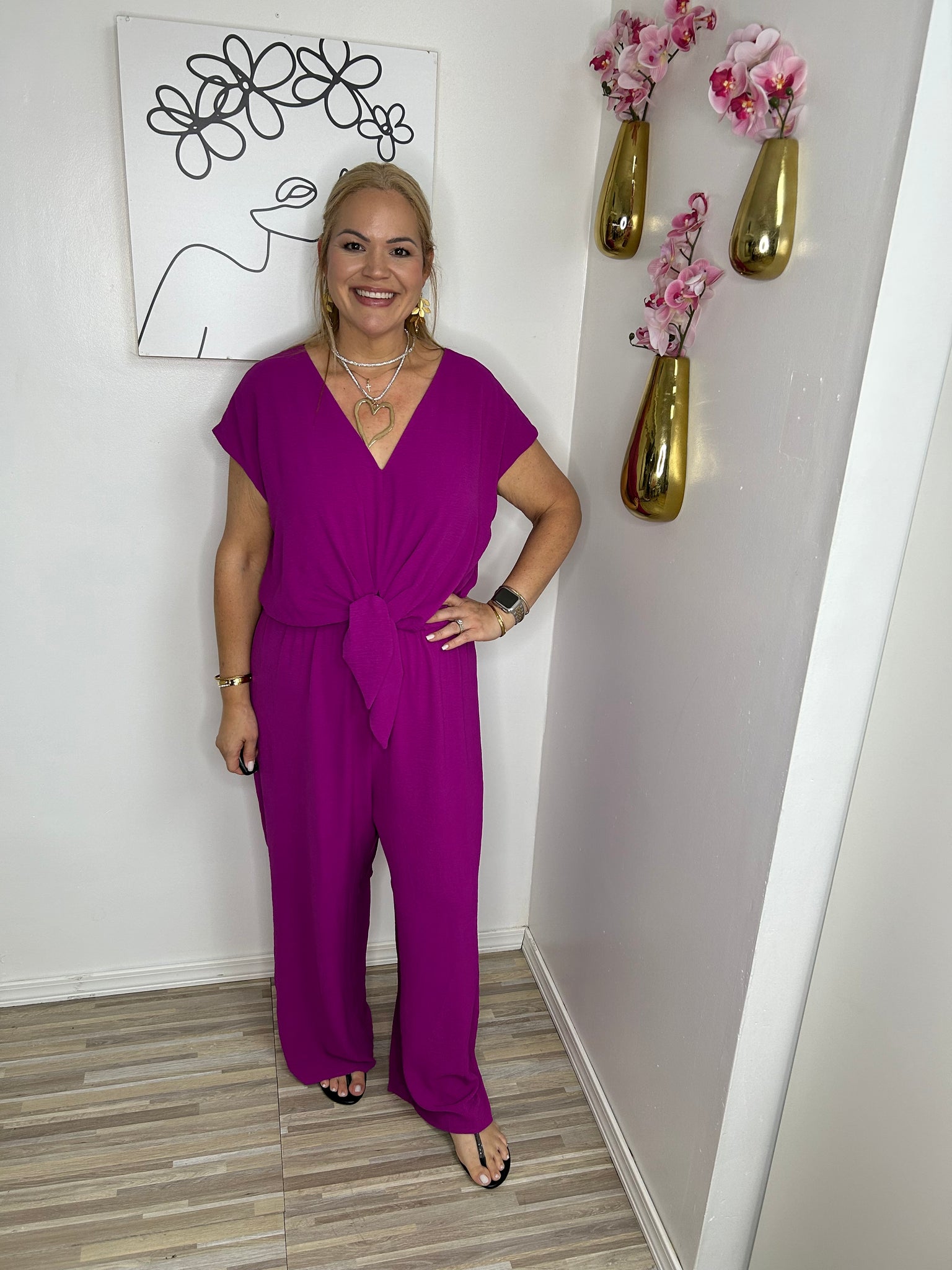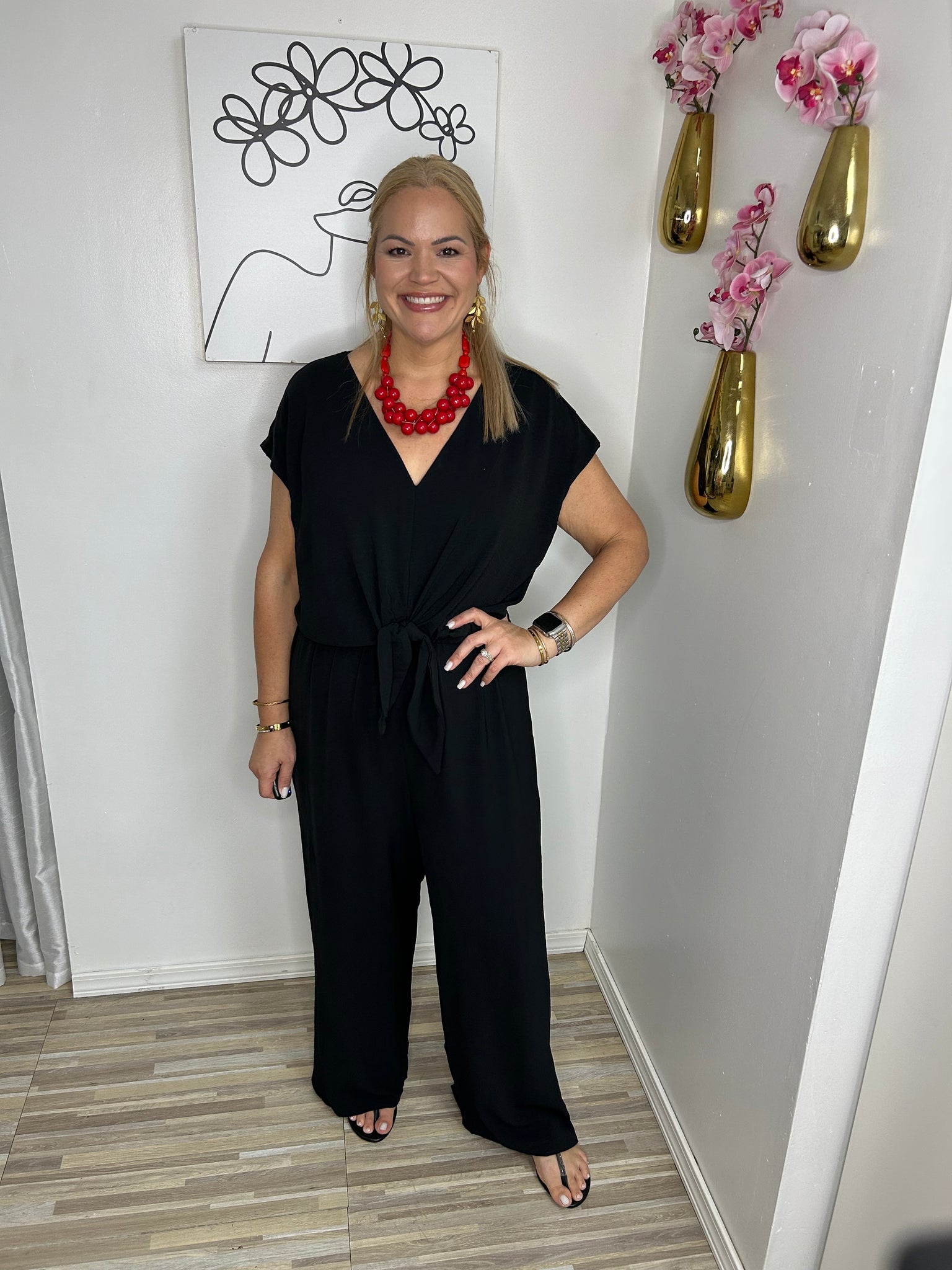 Short sleeve woven jumpsuit with front tie detail and back button closure.