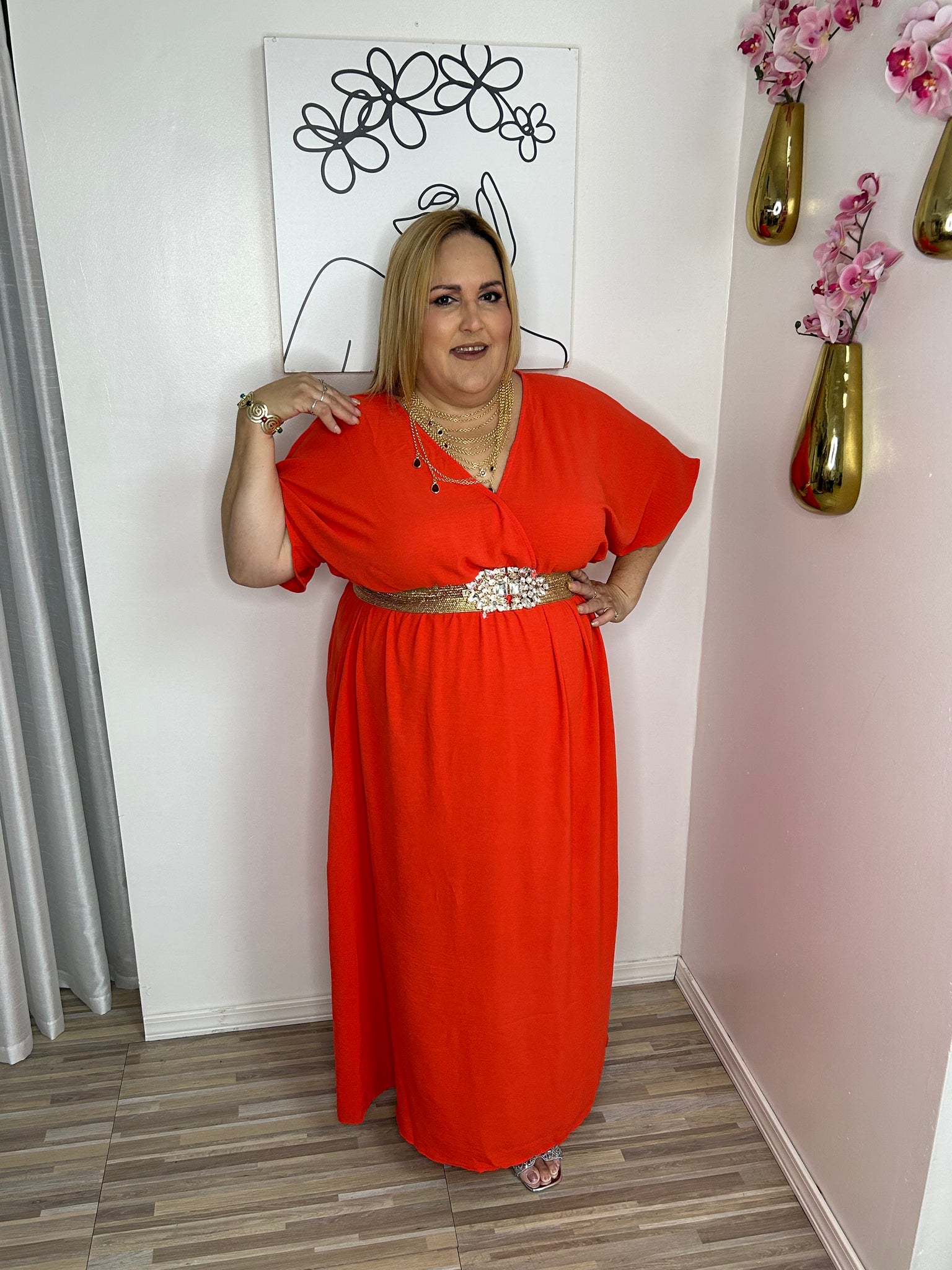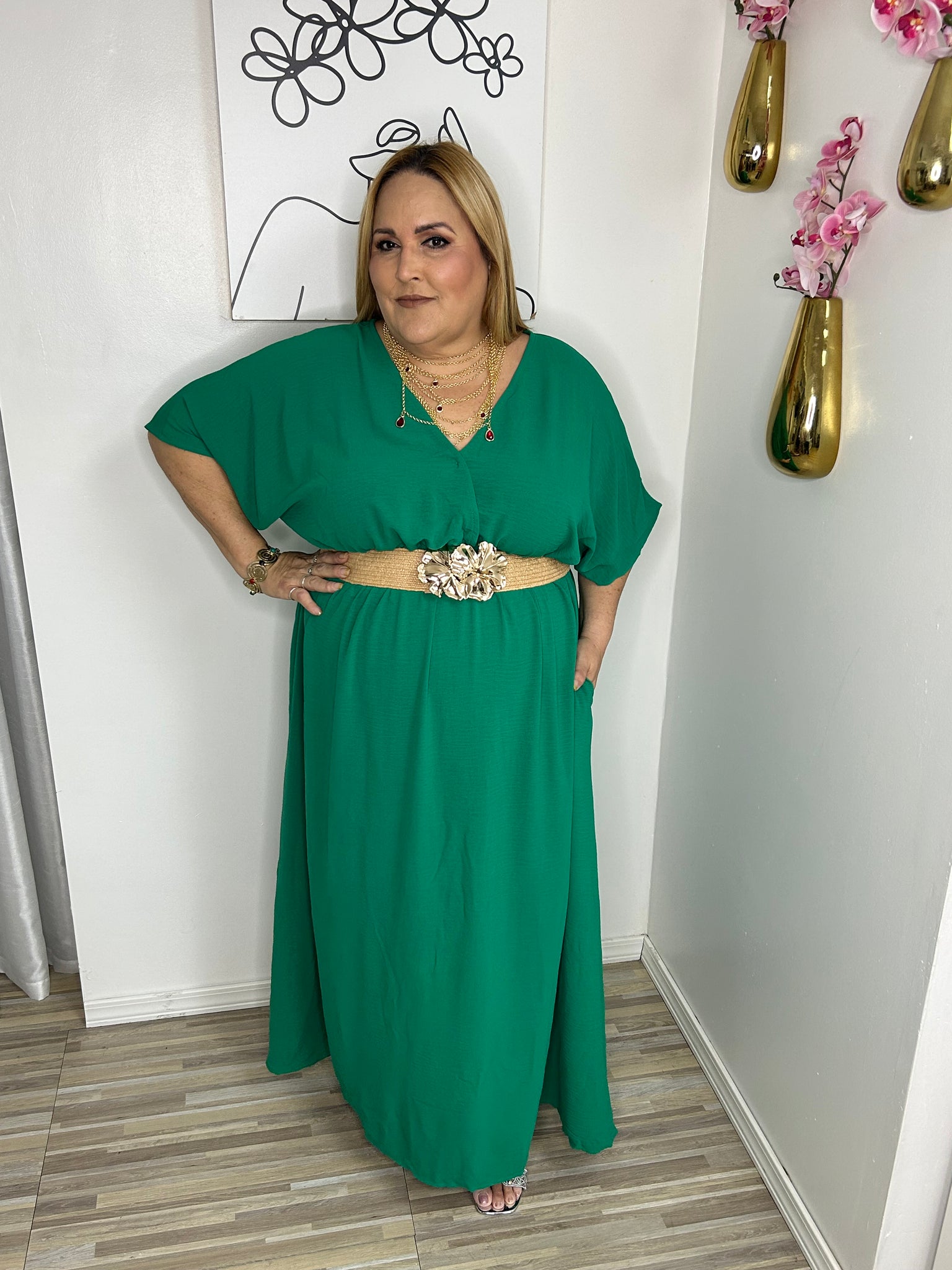 Woven maxi dress featuring a surplice neckline, sort dolman sleeves, elasticized waist, side pockets and column silhouette.